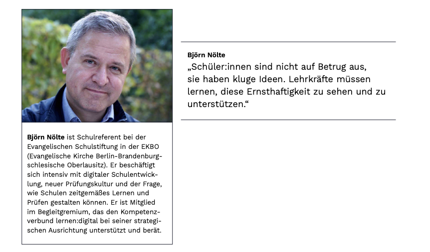 In einem Doppelinterview hat Björn Nölte zusammen mit der Schülerin Maja Zaubitzer erklärt, wie Prüfungen gestaltet werden müssen, die einen klugen Umgang mit KI fördern. Nölte sagte unter anderem: